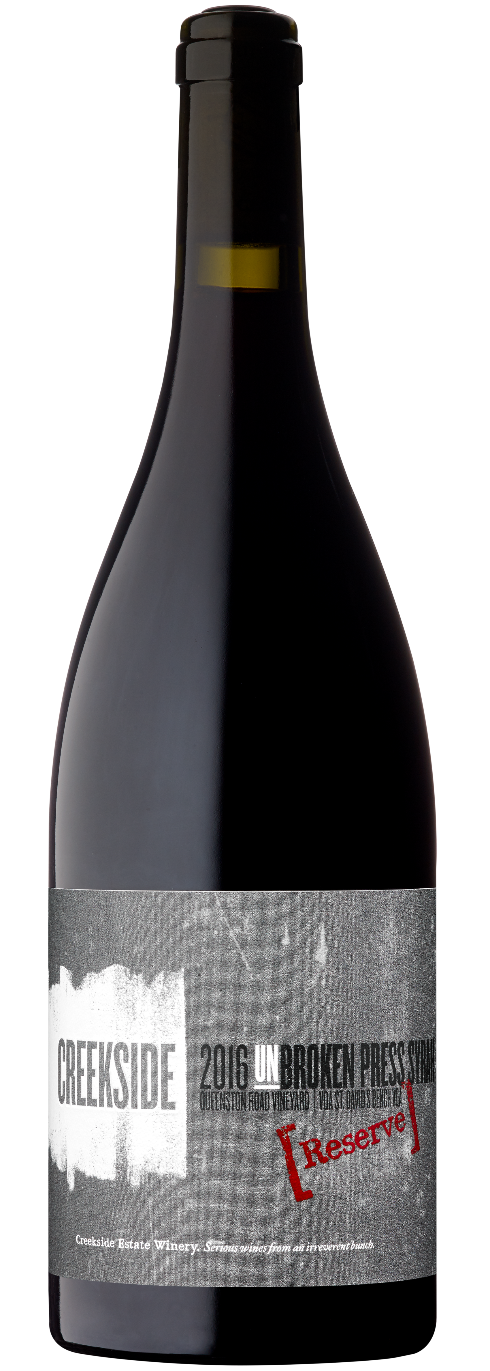If you aren’t familiar with our Broken Press Syrah, we think you should try a bottle. But wait a minute – this bottle is UNBroken Press – huh? Well, we didn’t “unbreak” anything: the bad pun refers to the fact that, while Broken Press features a bit of co-fermented Viognier for complexity, the UNBroken is 100% Syrah, pure and proud from our Queenston Road Vineyard. What’s the diff? Without gentle, sweet Viognier to soothe its fevered brow, Syrah’s inherent brooding power rages unchecked, untamed and yes, UNBroken. Take a ride on this bucking’ bronco and catch the spirit.